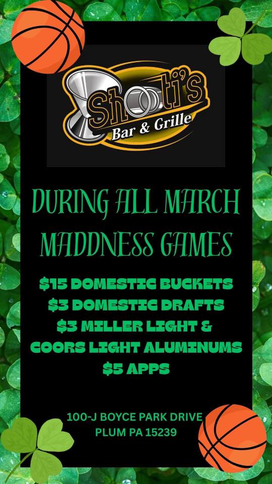 Shooti’s Bar and Grille has been Plum Borough’s premier sports bar since 2000. With more than 10 big screen TV’s you’ll never miss your favorite game. Combine that with your favorite draft beers and an awesome menu you’ll never be disappointed at Shooti’s.